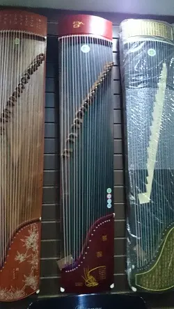 同楽器店の壁には琴。中国の楽器だと学生は言ったが、これは日本にもあるよね? 何はともあれ珍しかったので写真に収めました。