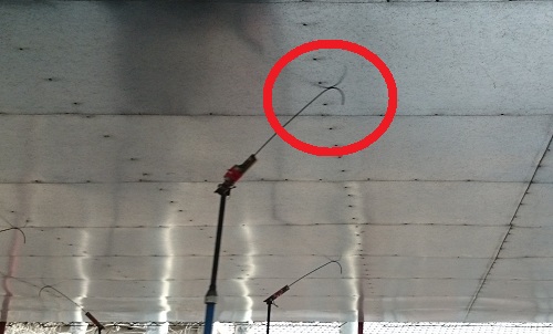 車体の後部からは1本のワイヤー(?)が上に伸びており、天井に接しています。ここからしばしば火花が飛ぶところを見ると、おそらくワイヤーを伝って車体に電力を供給しているんじゃないかと思います。どうなんですかね・・・。あまり見ないので詳しいことは分かりません。