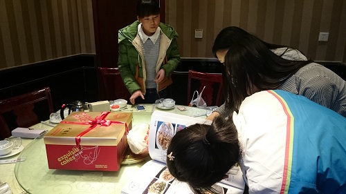 食後、みんなでケーキを食べました。冠を被っているのが今日の主役、劉さん。19歳になったそうです。