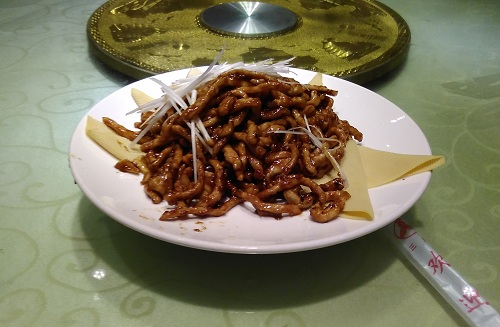 続々と食べ物が運ばれてきます。私含め9人もいるので、円卓は賑やかです。そして今日の食べ物で一番おいしかったのはこれ。「なんとか肉絲」です。名前は相変わらず分からないので、おいしかったものは写真に撮るようにしてます。とにかくおいしい。これとご飯の相性は最高でした。