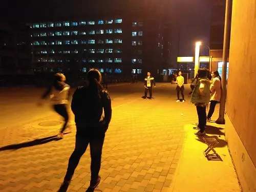 夜だというのに寮の周囲ではバドミントンをする姿が多く見られます。最初は数人の1年生と遊んでいたのですが、「先生が来てる」という噂を誰かが広めたせいで次第に学生が増えて増えて・・・。主な明かりは街灯だけ。羽根が高く上がると逆光で見えなくなるのも夜ならではです。けど十分楽しめました。何人も集まると日本語を話すことの抵抗が薄れるのでしょう。こういう交流は今後も続けていきたいですね。私との関係を縮めることが日本語の上達に必ず役に立つはずですから。