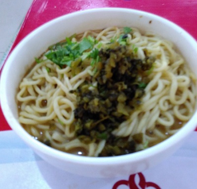 麺と書かれているので、ラーメンの一種でしょう。特徴はスープがほぼありません。食べる前に底にある味噌のような調味料と麺をかき混ぜます。味はとても濃い!!と最初は思ったんですが、食べているうちに慣れてしまう、不思議なものです。今実家のご飯を食べたら、味が薄いとか思っちゃうかもしれないのが少し怖いですが・・・。 とても美味しいですよ。これで4元(80円)。おなかいっぱいになるには十分な量でした。