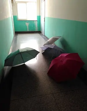 この先は行き止まり。扉はありますが、開けられません。誰の傘かは分かりませんが、誰の邪魔にもならないよう行き止まりを利用して傘を乾かしているのでしょう。