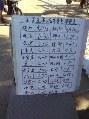 また、河北省の各都市への宅配は重量により料金が変わります。一斤とは0.5kgのことで、学生は「高い!」と言ってましたね。たくさん荷物があれば何十元もかかるでしょうから、学生には確かに高いと感じるかもしれません。しかし、日本と比べると驚くほど激安。羨ましい限りです。