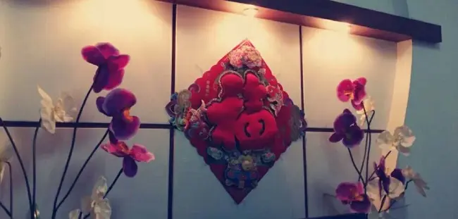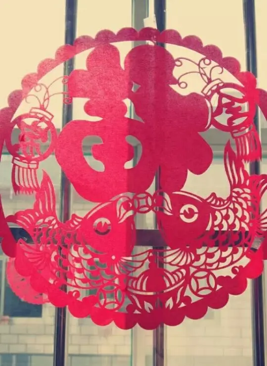 この写真に写っているのは「春联(chun1 lian2)」というようで、赤い紙を使って縁起の良い言葉や図形をかたどったものだそうです。よく見ると、「福」の文字が裏返しになっていますが、これには理由があり、裏返しにして窓に貼ることで福がやって来るという意味があるみたいです。