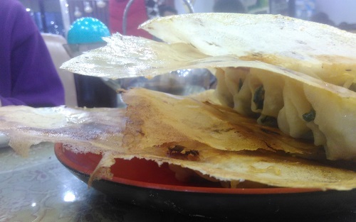 皿を大きくはみ出る羽、ここまで綺麗に作れるのは凄いですよね。豚肉と白菜の餡で注文しました。これが肉汁たっぷりで本当に絶品。20個20元で非常に安く、これとご飯があればもう十分です。中国で食べた料理の中で堂々の1位になりました。学校から近いこともあり、良い店を発見したなあと思ってます。