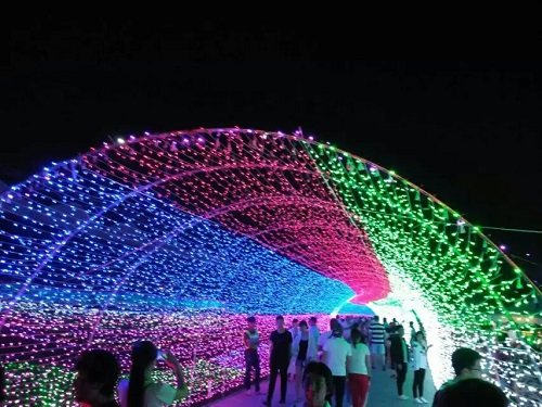 いざ会場にはいるとLEDで装飾された園内が眼前に広がります。敷地内は広大で、結局歩いて1時間以上はかかったんじゃないかなと思います。こういうイルミネーションはクリスマスの時期を想起させます。私としては夏に見るのは初めてどころか、人生で初めての経験になりました。一緒に行った4名は女の子ですから、あっちこっちと写真を撮って歩き回ってましたね!