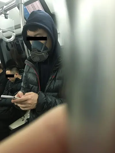 北京の地下鉄で撮った写真なのですが、ガスマスクをがっちり装着しています。もちろん大気汚染から肺を守るためなのですが、ここまでやるとちょっと引いてしまいますね。