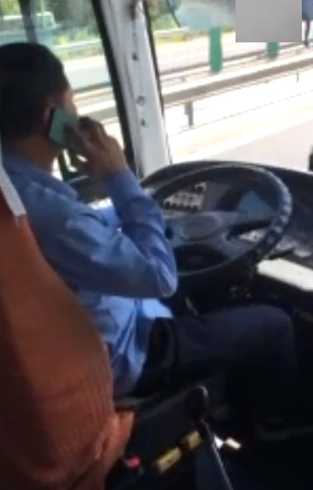 長距離バスの運転手さんが、高速で電話してるところです。
