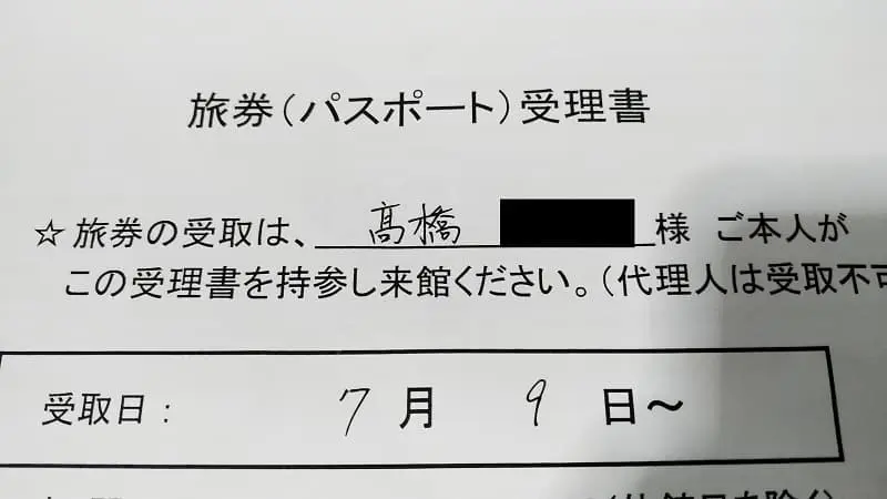 申請が終わると「旅券(パスポート)受理書」をもらいます。次回これを大使館に持って行って、新パスポートとの交換となります。私は金曜日に申請したので、3日挟んだ火曜日には受け取れるとのことでした。
