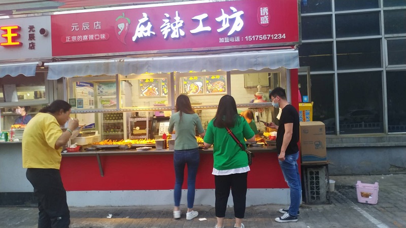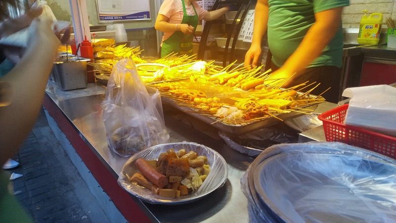 串に刺さった豆腐やらソーセージやら野菜やら何やらが出汁につけられています。食べたいものを右側にある銀の皿に自分で取って会計を済ませる形式です。食べ物が外気に晒されているので風が強いとゴミなんかも入っちゃう気がしますが、そのあたりは気にしないのが中国流ですね。私はもう慣れました。