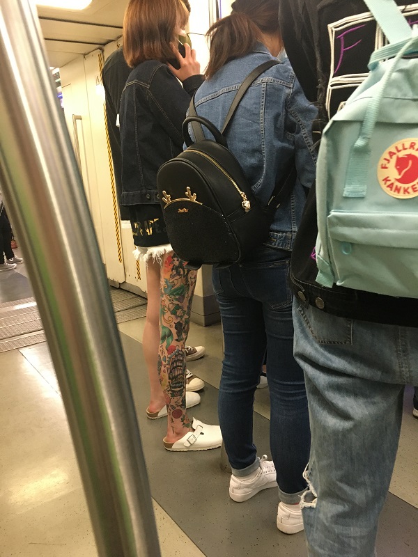 北京の地下鉄で見つけた、右足全体に入れ墨が入った女性です。それを見せつけるかのような露出で圧倒的に目を引きます。写真に写ってはいませんが、女性の奥の方に彼氏を思わしき人がいます。その男性は女性よりもすごい入れ墨が入ってました。類は友を呼ぶと言うべきなのか、それともどちらか一方が勧めたのか。いずれにしても圧巻です。