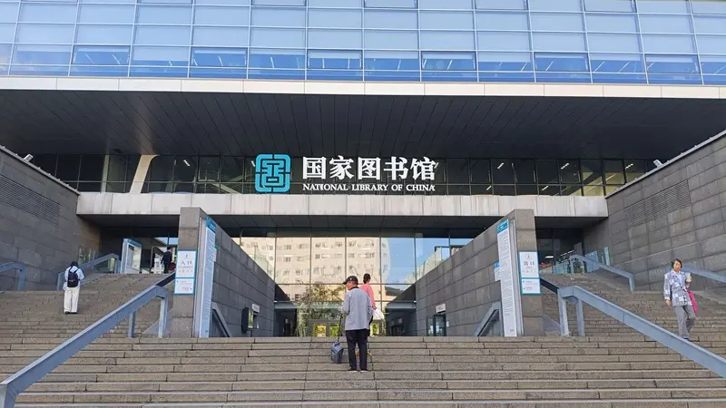 中国国家图书馆は南側の建物と北側の建物に分かれていて、それぞれつながっていません。まずは地下鉄を下りて南に行き、南側の建物に入りました。入口の様子は↑。