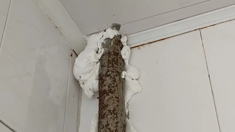 それから、部屋には↑の写真のようなパイプがあちこち通っています。これは建物全体の暖房にあたるものなんですが、パイプはむき出しです。日本と違ってパイプを壁の中に入れるようなことはしません。建物が作られた後に穴が開けられるようです。だからパイプを通すために開けられた穴の周囲には大きな穴が開いていて、ここが大きな侵入経路になっています。この種の穴は大きすぎて、上の白いやつでは対応不可能です。だから、スプレーを吹きかけると膨張するような? 家の断熱材とかに使われているようなアレを買って、この穴に中に吹き付けて穴を塞ぐという措置をとりました。初心者なのでパイプの側面から漏れ出てきてますが、雑だけどとにかく塞いでおくことが大事です。