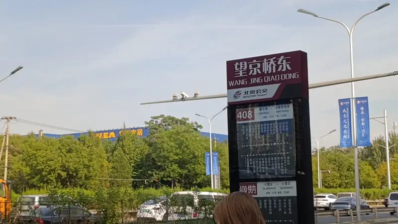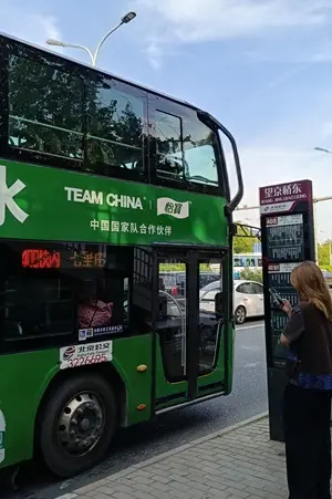 バスは各駅停車のと快速のがあって、「快」と書かれているバスは止まらない駅があってどんどん進みます… と思いきや、お昼3時頃だったのに道路はもう渋滞気味で、言うほど早くはないです。北京の幹線道路は車線が4車線以上あるのに、一日中どこかで必ず渋滞しているみたい。↑の写真は2階建てのバスで、乗り込むときに専用アプリのQRコードを機械に読み取ってもらい、降りるときにも同じQRコードを読み取ってもらえば自動的に引き落としされます。「亿通行」というアプリなんですが、これが地下鉄もバスも共通で使えるアプリで、しかも中国ならどこの都市でも使える神アプリです。