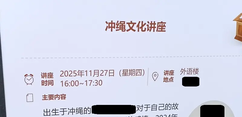 この大学では、外部から講師を呼んで講座をするっていう機会が結構あるみたいです。外国語学院の前にはちょくちょく開講される講座を紹介する立て看板があって、そのほとんどは英語関係の講座なんですが、今回たまたま「沖縄」という日本関係の文字を見かけたのでせっかくだから行ってみました。講師が沖縄の方ということもあり、生の話を聞けるチャンスだと思って。