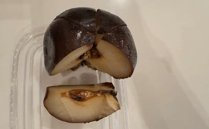 何かと思いきや、梨だそうです。「冻梨」というハルピンの食べ物。凍らせた梨は黒くなるそうで見た目は丸い炭です。昔食べ物があまり無かった頃は、収穫した梨をこのようにして保存し、冬のおやつにしていたそうです。この梨は1個5元で恐ろしく安い。買うと店員さんが切れ込みを入れてくれます。