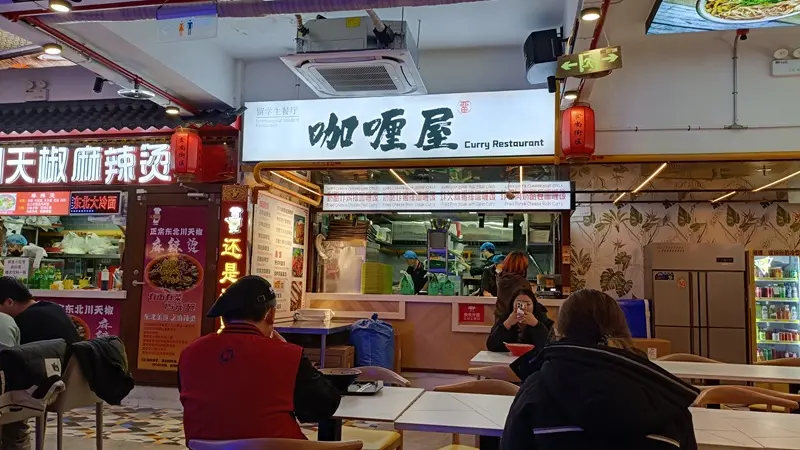 電動バイクを手に入れて格段に移動が便利になったから、ちょっと遠くの気になるお店とかにも行けるようになりました。19日(金)は前からちょっと気になってた「留学生餐厅咖喱屋」というカレー屋さんへ。場所は”民族大学西路8号院1号楼”の食尚美食街ってところで、住まいから7kmくらい、電動バイクで30分くらいです。4階はたくさんお店があってその真ん中に座るところがあるフードコートみたいな感じです。