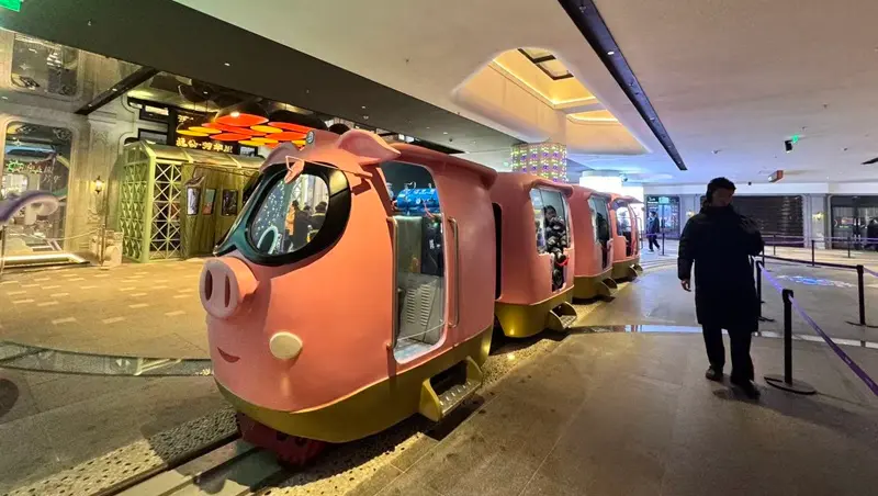食尚美食街の入り口には、地下2階と地上1階をつなぐピンクの乗り物があります。乗るのは無料で、一度見てしまったら乗ってみたくならないわけないですね。片道5分くらいで楽しめます。