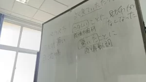 私は午後1時半から5時くらいまでずっと授業があったんですが、ずっと見学していました。授業している私は時間間隔的にあっという間なんですけど、受ける人にとっては長いものですよね。話を聞くと、この大学に2週間ほど短期留学をしていて、昨日来たそうです。まず最初の1週間は様々な先生の授業を見学し、次の2週目で実際に授業をしてみるという予定だそう。応援したくなります!
