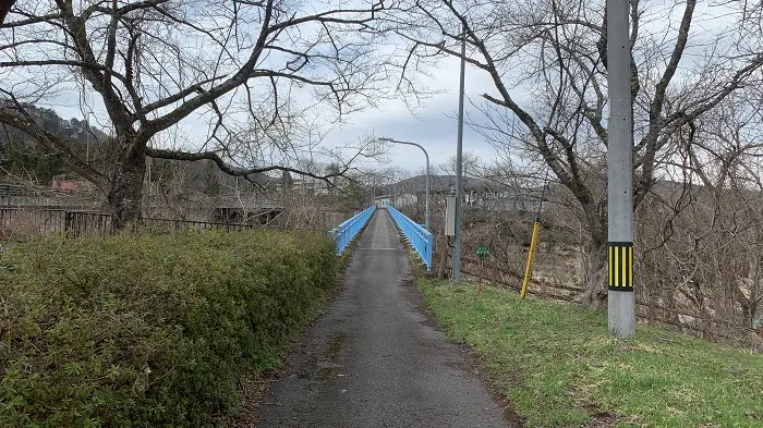 青色の歩行者専用の橋に近づくと、この橋の右手には新郷ダムが見えます。
