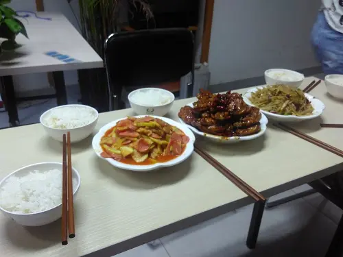 「先生は西红柿食べますか?」「紫色的蔬菜(茄子)食べますか?」「辣椒食べますか?」などなど、中国語で食べ物に関する質問をやけにしてきたと思ったら、台所で私のために料理を作ってくれていました。これは彼女達が作った料理です。私は野菜を全く食べないという子供染みた特徴があり、知らず知らずのうちに大変迷惑をかけていたようです。野菜ならあれもこれもダメダメ!と私は言っていたので、困ったのでしょう。それでも、真ん中の鶏の手羽先は一番美味しかったです。隠し味でコーラを使って煮たとのこと、衝撃的です。どうりで甘かったのか・・・。