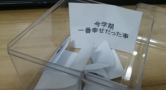 6枚の紙が入ってる箱から1枚引かせて、その内容を話題に会話します。いろいろ考えたのですが、テーマは「今学期一番○○だった事」にしました。楽しい、嬉しい、悲しい、悔しい、苦しい、幸せの6つの感情です。どれが当たるかは分からない分、即興性が出て実に会話の試験らしいですよね。これが第一部です。