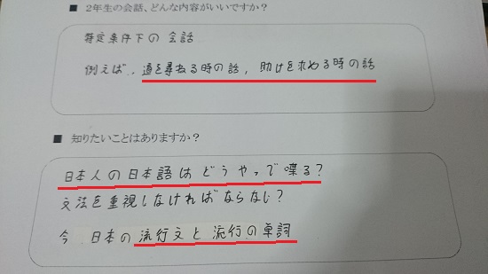 実は1年生の初めての授業のときもアンケートを書いてもらいました。そのときは当然ながら中国語で答えていたんですが、今回はすべて日本語での回答。こういう小さなところに成長を感じますね。内容を見ても大変参考になります。こういうことを求めてたんだーと気づかされるし、この方向で授業を進めても良さそうだなと再確認できるので、授業の幅が広がるようです。