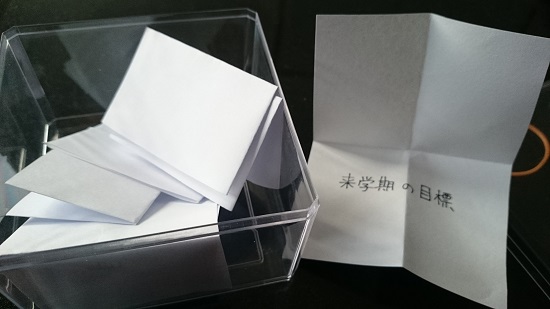 箱の中にいくつかの紙。これから一つ引いてもらい、その紙に話すテーマが書かれています。