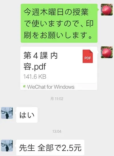 最初の頃は私も悩みました。初めは自腹でやってたのですが、最終的には早目に授業準備をし、学生に微信でデータを配布し、自分で印刷させることで解決しました。だから自宅にスキャナがあると凄く便利です!