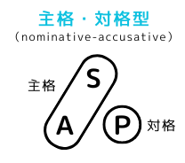 SとAが同じ格標識(主格:nominative)によって表され、Pはそれとは別の格標識(対格:accusative)で表す格標示体系を対格型(主格・対格型:nominative-accusative)といいます。このタイプはSとAが形態的・統語的に同じように扱われており、それらにPが対立しています。日本語にも英語にも対格型が見られます。