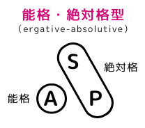 SとPが同じ格標識(絶対格:absolutive case)によって表され、Aはそれとは別の格標識(能格:ergative)で表す格標識体系を能格型(能格・絶対格型:ergative absolutive)といいます。このタイプも対格型と同様に世界の諸言語に見られます。