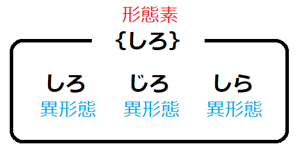 形態素は常に同じ形態で実現するわけではないです。例えば、形態素{しろ}は、それが単独で現れる環境や「猫」が後接する環境では「しろ」という形態で現れ、「色」が前接する環境では「じろ」という形態が現れ、「樺」が後接する環境では「しら」という形態が現れます。ある一つの形態素に異なる環境で実現する形態が複数ある場合、それらの実現体を異形態(allmorph)と呼びます。上記の例でいえば、「しろ」「じろ」「しら」という形態は形態素{しろ}の異形態です。言い換えると、「しろ」「じろ」「しら」という形態を抽象化したものが形態素{しろ}。形態素は抽象的な単位で、それが実現されたものが形態です。