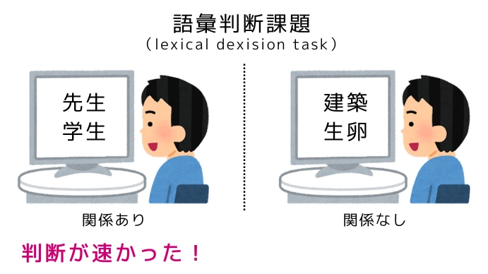 上下に表示された文字列の上のほうを先に処理すると考えれば、上記の例の「先生」がプライム(先行刺激)にあたり、これによって「学校」「教室」「学生」「授業」などの意味的に関連する概念が次々活性化されます。その後、文字列の下のほう「学生」を処理するとき、「学生」はプライムによってすでに活性化されているので反応が早くなります。