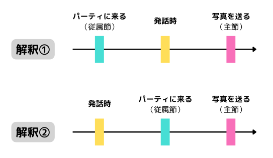 解釈①の場合はもうすでにパーティは終わっていて、(5)の発話をした後に写真を送るという流れです。解釈②の場合は、まだパーティは始まっていないけど、未来に起こる事態であるパーティに来た人に対して写真を送るという時系列になります。
