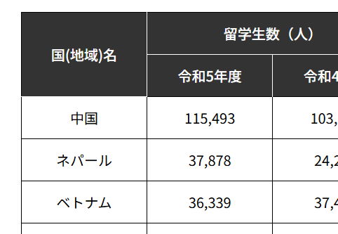 「2023(令和5)年度外国人留学生在籍状況調査結果」によると、国地域別留学生数の上位3か国は中国、ネパール、ベトナムでした。