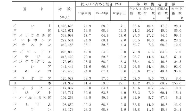 6ページにはこのような表によると、日本の人口は  124,352(千人) 、インドネシアの人口は  277,534(千人) でインドネシアのほうが多いです。また、15~64歳人口の割合は、日本は  59.5% 、インドネシアは  68.1% でインドネシアのほうが高いです。