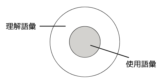 理解語彙と使用語彙の領域を図式化すると上記のようになります。使用語彙は必ず理解語彙に含まれるため、使用語彙よりも理解語彙のほうが常に多いです。