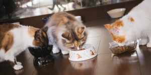 (1) ネコちゃんたちがおいしそうにご飯をカリカリと食べている。