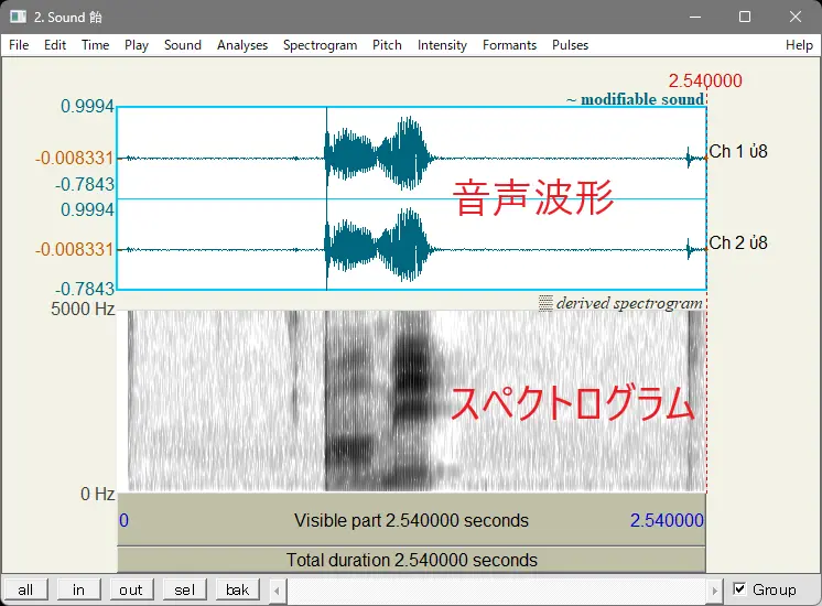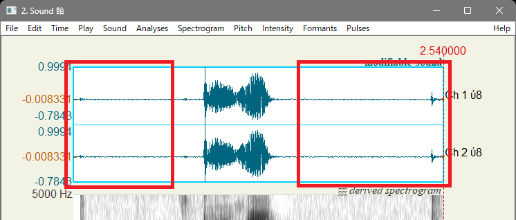 録音した音声は、分析したい部分だけあれば十分です。余計な部分があったり、パソコンで録音する場合ははじめと最後にクリック音が入っていたりしていることがあるので、そこの部分は Praat上で編集できます。