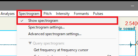 スペクトログラムは[Spectrogram]-[Show spectrogram]で表示させられます。
