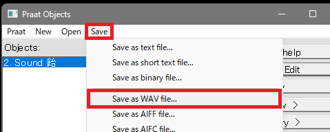音声を編集しても保存しないで Praat を閉じてしまうと、そのファイルは消えてしまいます。なので必要なものは編集をしたら保存するようにしましょう。