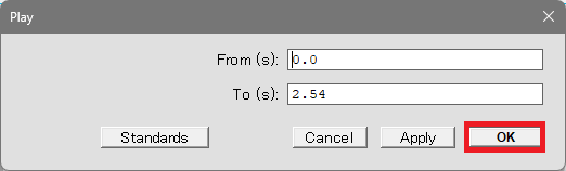 すると上のような画面が表示されます。「From (s)」と「To (s)」にはそれぞれ音声ファイルの長さの下限と上限が初期値として入力されています。上の画像で選択された音声は2.54秒の長さを持つファイルだったので、その下限である 0.0秒 と上限である 2.54秒が入力されています。この数字を変えることで再生される部分が変わりますが、ここでは気にしなくていいので[OK]をクリックします。すると波形の左側から右側へとバーが流れて音声が再生されます。