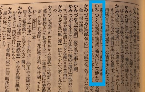 後者の基準②〔直接受身になる動詞〕で「噛みつく」は他動詞なんだって納得すれば話はそこで終わりなんだけど、前者の基準①〔対象をヲ格でとる動詞〕で自動詞だって言われてもまだ納得できない人もいると思います。働きかける対象に変化を与えるのが典型的な他動詞。「噛みつく」だって噛みつかれた人は怪我するだろうし、怪我しなくても噛みつかれた部分は形が変わるだろうし、やっぱり他動詞な気がします。