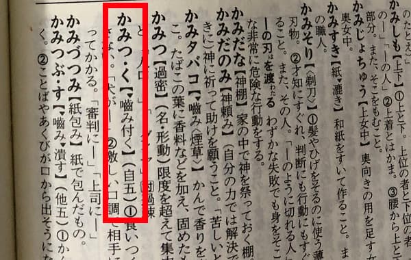 後者の基準②〔直接受身になる動詞〕を用いると「壊す」「殴る」「褒める」などは前者の基準と同じく他動詞になります。しかし「噛みつく」も直接受身にできるのでこれも他動詞に。