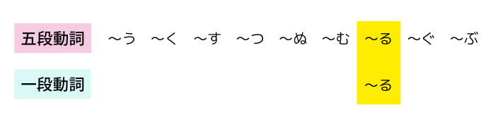 ②「る」で終わらない動詞は、「る」の前が /a,u,o/ なら五段動詞、/i,e/ なら一段動詞。
