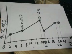 発表者はそのグラフをもって教壇まで来て、特に山と谷について詳しく説明していきます。内容によっては長くなるかもしれませんが、せいぜい3分~5分程度かな。時間の余裕と盛り上がり次第で延長したり調整します。これまでいろんな経験があったはずだけどそれを全部この紙に書けない。だからこそグラフに書かれる浮き沈みは本人にとってそれほど重要な出来事だったってことですね。