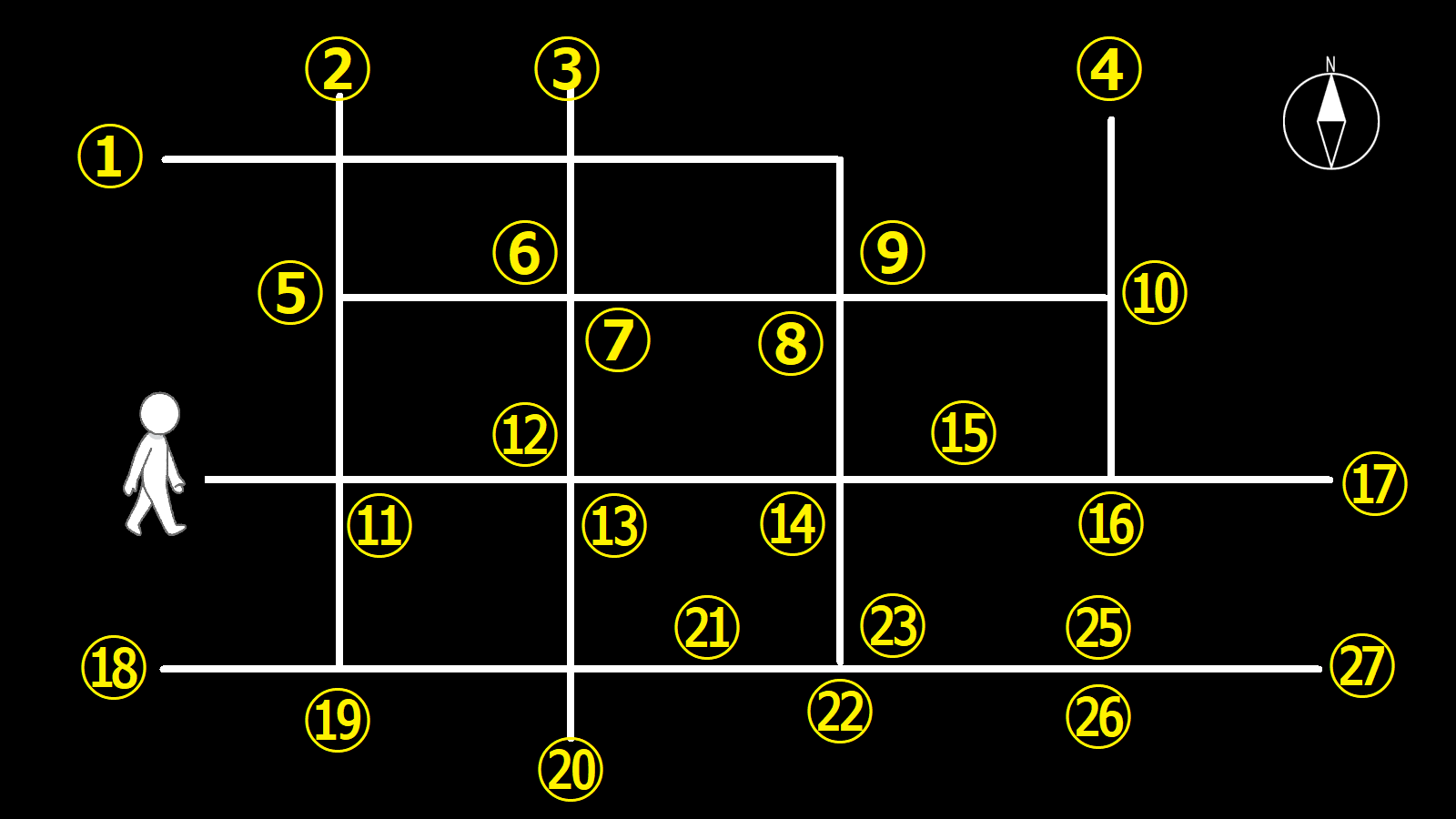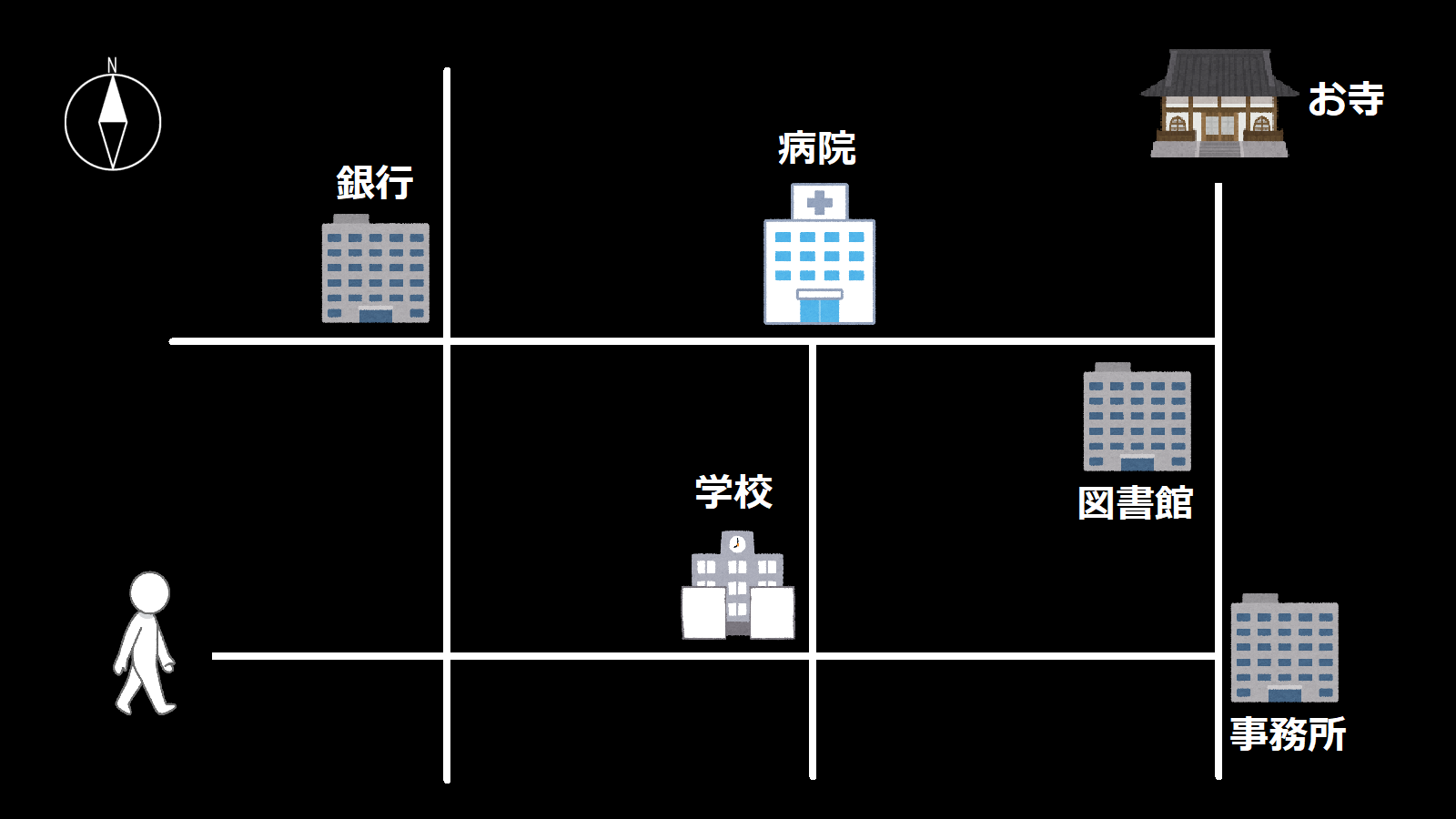 交差点/十字路、丁字路、L字路、右に曲がる、右折する、東に進む、左に曲がる、左折する、西に進む、真っ直ぐ進む、直進する、北に進む、南に進む、角、北東、北西、南東、南西…